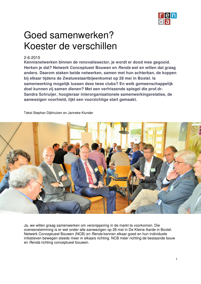 Kennisnetwerken binnen de renovatiesector, je wordt er dood mee gegooid. Herken je dat? Netwerk Conceptueel Bouwen en Renda wel en willen dat graag anders. Daarom staken beide netwerken, samen met hun achterban, de koppen bij elkaar tijdens de Zwaluwstaartbijeenkomst op 28 mei in Boxtel. Is samenwerking mogelijk tussen deze twee clubs? En welk gemeenschappelijk doel kunnen zij samen dienen? Met een verfrissende spiegel die prof.dr. Sandra Schruijer, hoogleraar interorganisationele samenwerkingsrelaties, de aanwezigen voorhield, lijkt een voorzichtige start gemaakt.