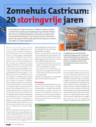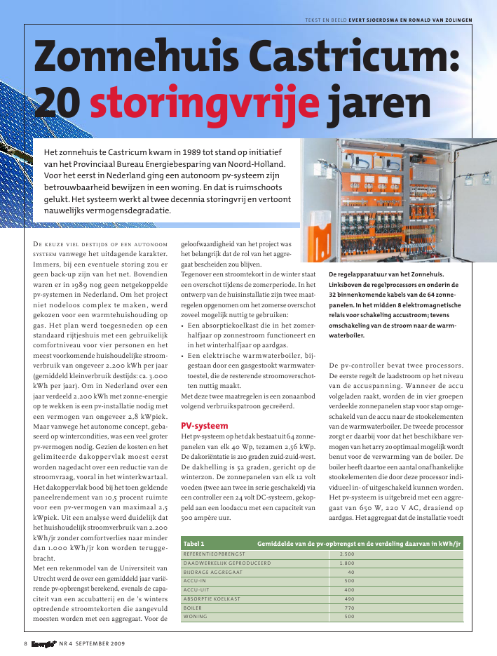 8 nr 4 september 2009TeksT en beeld EvErt SjoErdSma En ronald van ZolingEngeloofwaardigheid van het project washet belangrijk dat de rol van het aggre-gaat bescheiden zou blijven.Tegenover een stroomtekort in de winter staateen overschot tijdens de zomerperiode. In hetontwerp van de huisinstallatie zijn twee maat-regelenopgenomenomhetzomerseoverschotzoveel mogelijk nuttig te gebruiken:? Eenabsorptiekoelkastdieinhetzomer-halfjaar op zonnestroom functioneert enin het winterhalfjaar op aardgas.? Eenelektrischewarmwaterboiler,bijgestaan door een gasgestookt warmwater-toestel,diederesterendestroomoverschot-ten nuttig maakt.Met deze twee maatregelen is een zonaanbodvolgend verbruikspatroon gecre?erd.Pv-systeemHetpv-systeemophetdakbestaatuit64zonne-panelenvanelk40Wp,tezamen2,56kWp.Dedakori?ntatieis210gradenzuidzuidwest.Dedakhellingis52graden,gerichtopdewinterzon.Dezonnepanelenvanelk12voltvoeden (twee aan twee in serie geschakeld) viaeencontrollereen24voltDCsysteem,gekop-peld aan een loodaccu met een capaciteit van500amp?reuur.De keuze viel DestijDs op een autonoomsysteem vanwege het uitdagende karakter.Immers,bijeeneventuelestoringzouergeen back-up zijn van het net. Bovendienwarenerin1989noggeennetgekoppeldepv-systemen in Nederland. Om het projectnietnodelooscomplextemaken,werdgekozen voor een warmtehuishouding opgas. Het plan werd toegesneden op eenstandaard rijtjeshuis met een gebruikelijkcomfortniveau voor vier personen en hetmeest voorkomende huishoudelijke stroom-verbruikvanongeveer2.200kWhperjaar(gemiddeld kleinverbruik destijds: ca. 3.000kWh per jaar). Om in Nederland over eenjaarverdeeld2.200kWhmetzonneenergieop te wekken is een pv-installatie nodig meteenvermogenvanongeveer2,8kWpiek.Maarvanwegehetautonomeconcept,geba-seerdopwintercondities,waseenveelgroterpv-vermogen nodig. Gezien de kosten en hetgelimiteerde dakoppervlak moest eerstworden nagedacht over een reductie van destroomvraag,vooralinhetwinterkwartaal.Het dakoppervlak bood bij het toen geldendepaneelrendementvan10,5procentruimtevooreenpvvermogenvanmaximaal2,5kWpiek. Uit een analyse werd duidelijk dathethuishoudelijkstroomverbruikvan2.200kWh/jr zonder comfortverlies naar minderdan1.000kWh/jrkonwordenterugge-bracht.Met een rekenmodel van de Universiteit vanUtrecht werd de over een gemiddeld jaar vari?-rendepvopbrengstberekend,evenalsdecapa-citeit van een accubatterij en de 's wintersoptredende stroomtekorten die aangevuldmoesten worden met een aggregaat. Voor deDe pv-controller bevat twee processors.De eerste regelt de laadstroom op het niveauvan de accuspanning. Wanneer de accuvolgeladenraakt,wordendeinviergroepenverdeelde zonnepanelen stap voor stap omge-schakeld van de accu naar de stookelementenvandewarmwaterboiler.Detweedeprocessorzorgt er daarbij voor dat het beschikbare ver-mogenvanhetarryzooptimaalmogelijkwordtbenut voor de verwarming van de boiler. Deboilerheeftdaartoeeenaantalonafhankelijkestookelementen die door deze processor indi-vidueel in- of uitgeschakeld kunnen worden.Het pv-systeem is uitgebreid met een aggre-gaatvan650W,220VAC,draaiendopaardgas. Het aggregaat dat de installatie voedtZonnehuis Castricum:20 storingvrije jarenHet zonnehuis te Castricum kwam in 1989 tot stand op initiatiefvan het provinciaal bureau energiebesparing van noord-Holland.Voor het eerst in nederland ging een autonoom pv-systeem zijnbetrouwbaarheid bewijzen in een woning. en dat is ruimschootsgelukt. Het systeem werkt al twee decennia storingvrij en vertoontnauwelijks vermogensdegradatie.tabel 1 gemiddelde van de pv-opbrengst en de verdeling daarvan in kWh/jrRefeRenTieopbRengsT 2.500daadweRkelijk gepRoduceeRd 1.800bijdRage aggRegaaT 40accu-in 500accu-uiT 400absoRpTie koelkasT 490boileR 770woning 500De regelapparatuur van het Zonnehuis.Linksboven de regelprocessors en onderin de32 binnenkomende kabels van de 64 zonnepanelen.In het midden 8 elektromagnetischerelais voor schakeling accustroom;tevensomschakeling van de stroom naar de warmwaterboiler.nr 4 september 2009 9viaeenaccuregelaarvan750Wwordthand-matig gestart en automatisch gestopt. Depvinstallatielevert24voltDCaandewoningmaar ten behoeve van enkele apparaten die220voltACnodighebbeniseensinusom-vormer van 600 W ge?nstalleerd.resultaten pv-systeemDe verwachte betrouwbaarheid van het pv-systeemisdeafgelopen20jaargebleken:geen enkele storing deed zich voor en allezonnepanelen functioneren nog steeds naarbehoren. Zoals verwacht moesten de accu'sna acht jaar worden gewisseld. Bij de beoor-deling van deze levensduur moet men zichrealiseren dat de accu's dagelijks geladen enontladen worden en dat in de winter de accu'svaak gedurende lange perioden niet vollediggeladen worden. Daarna is steeds gebruikgemaakt van accubatterijen uit de no-breaksets van verouderde telefooncentrales en isgemiddeld om de vijf jaar gewisseld.Gedurende de eerste vijf jaren zijn meet-gegevens verzameld met een datalogger.Daarover is in het verleden uitgebreid gerap-porteerd. De tabel toont de langjarige gemid-deldenvandegemetenresultaten.Aandehuishoudelijke apparatuur is tussentijdsweinigveranderd,waardoorhetverbruiks-patroon vrijwel ongewijzigd bleef.De referentieopbrengst is de theoretischeopbrengstgebaseerdopdegemeteninstraling,het totale celoppervlak en het celrendementbij25gradenCelsius.Vandezereferentieopbrengstisgemiddeld72procentookdaad-werkelijkgeproduceerdengebruikt.Eenanderopmerkelijkgegevenishetlagehuishoudelijkestroomverbruikvan500kWh/jr,exclusiefdestroom voor de ongebruikelijke absorptiekoelkast. Inclusief een HR compressie-koelkast zou het verbruik 600 kWh/jr zijnvoor een comfortniveau waar zonder degenomenmaatregelen2.200kWh/jrvoornodig zou zijn geweest. Door de lage stroom-behoefte in de winter kon de bijdrage van hetaggregaat beperkt blijven.BetrouwbaarheidDe opmerkelijke betrouwbaarheid van hetsysteem rechtvaardigt een nadere beschou-wing van het ontwerp en de componenten.Uit recent uitgevoerde metingen aan hetarray blijkt dat de elektrische degradatie zogeringis(minderdan5%relatief)datdezeop loc